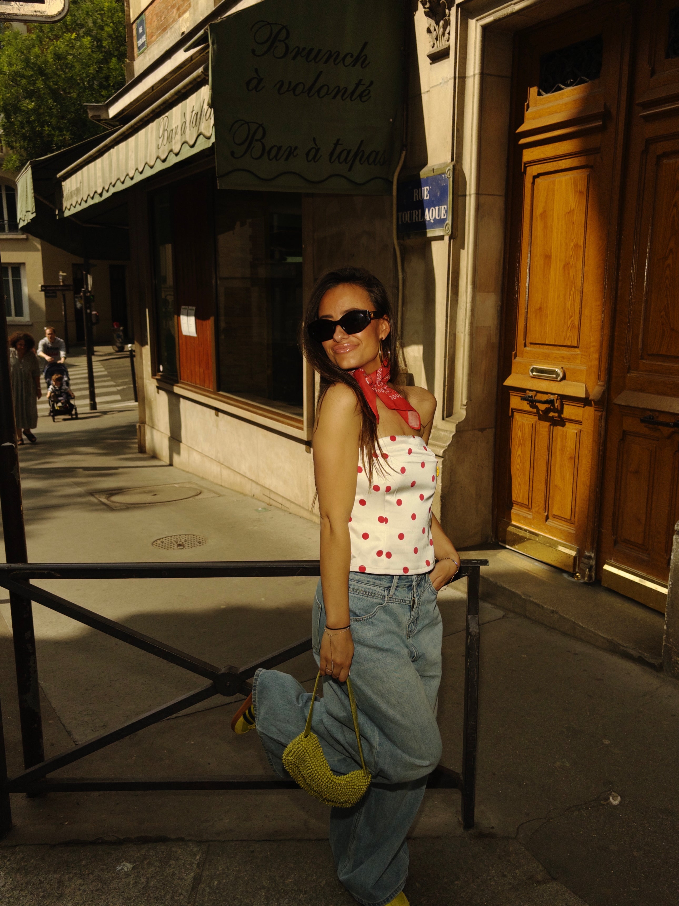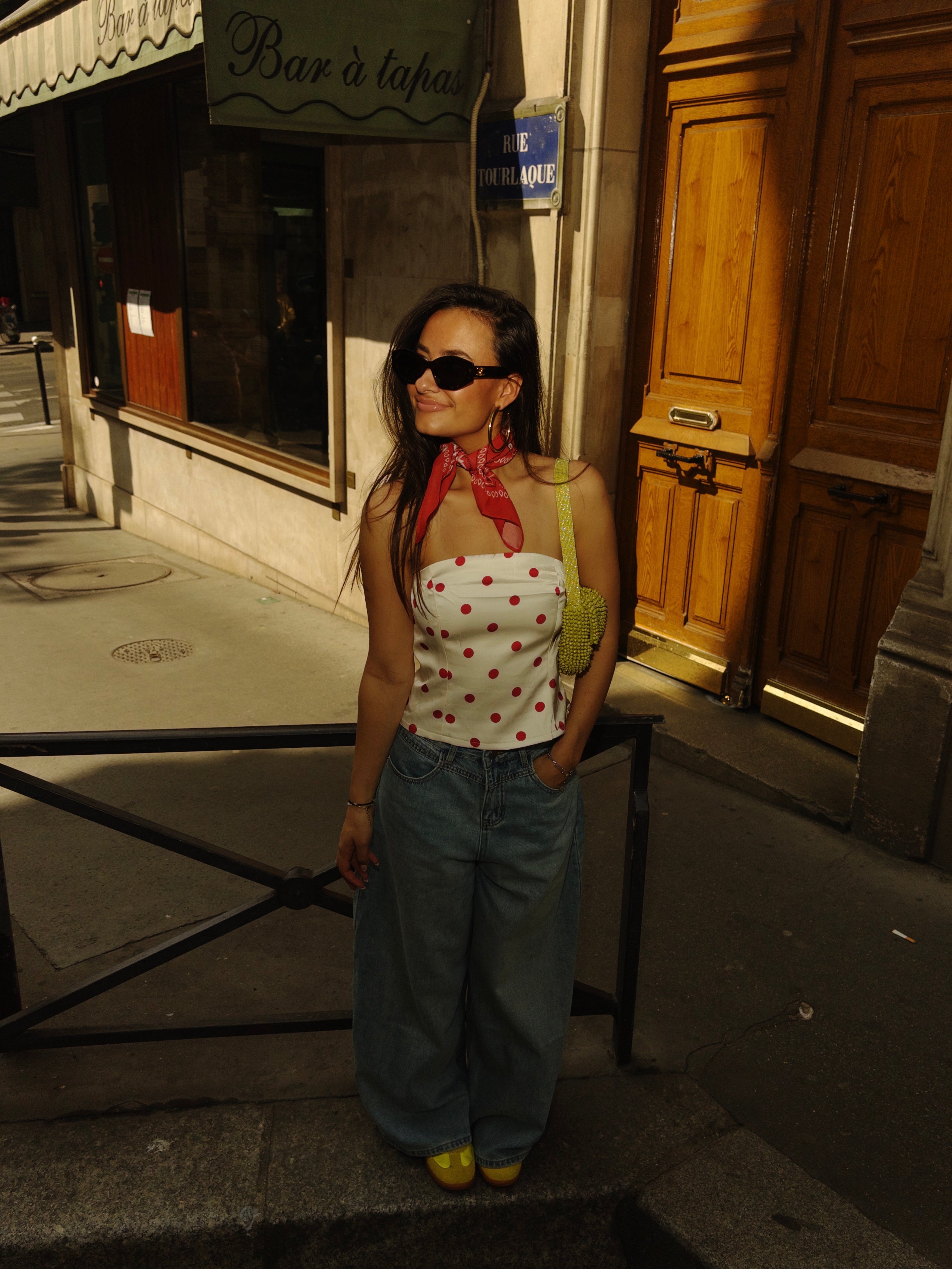 Strapless polka dot top.