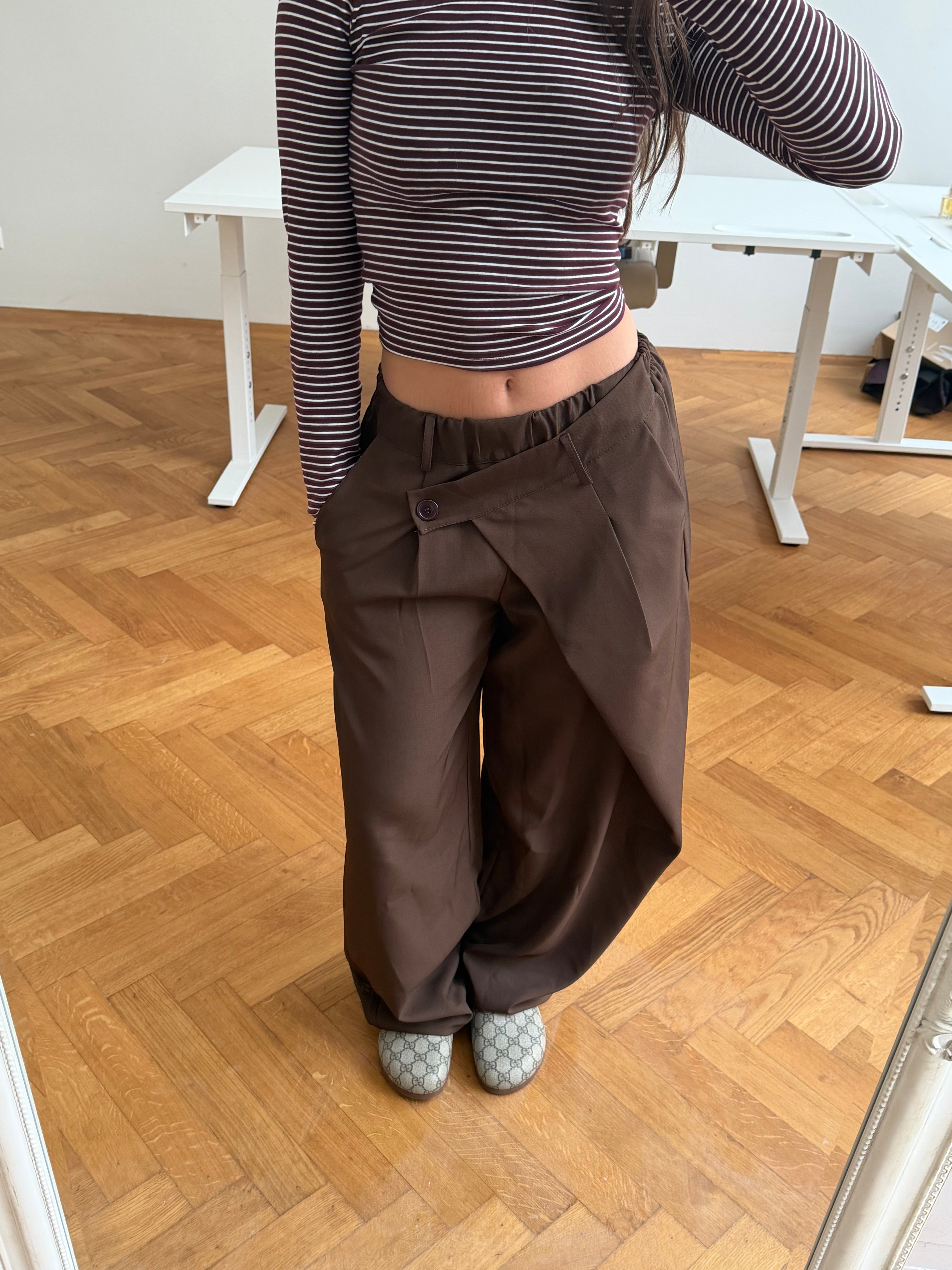 These brown trousers feature a unique wrap-over front with a button detail and a relaxed wide-leg fit. Made in a one-size design, they offer a comfortable and stylish look.