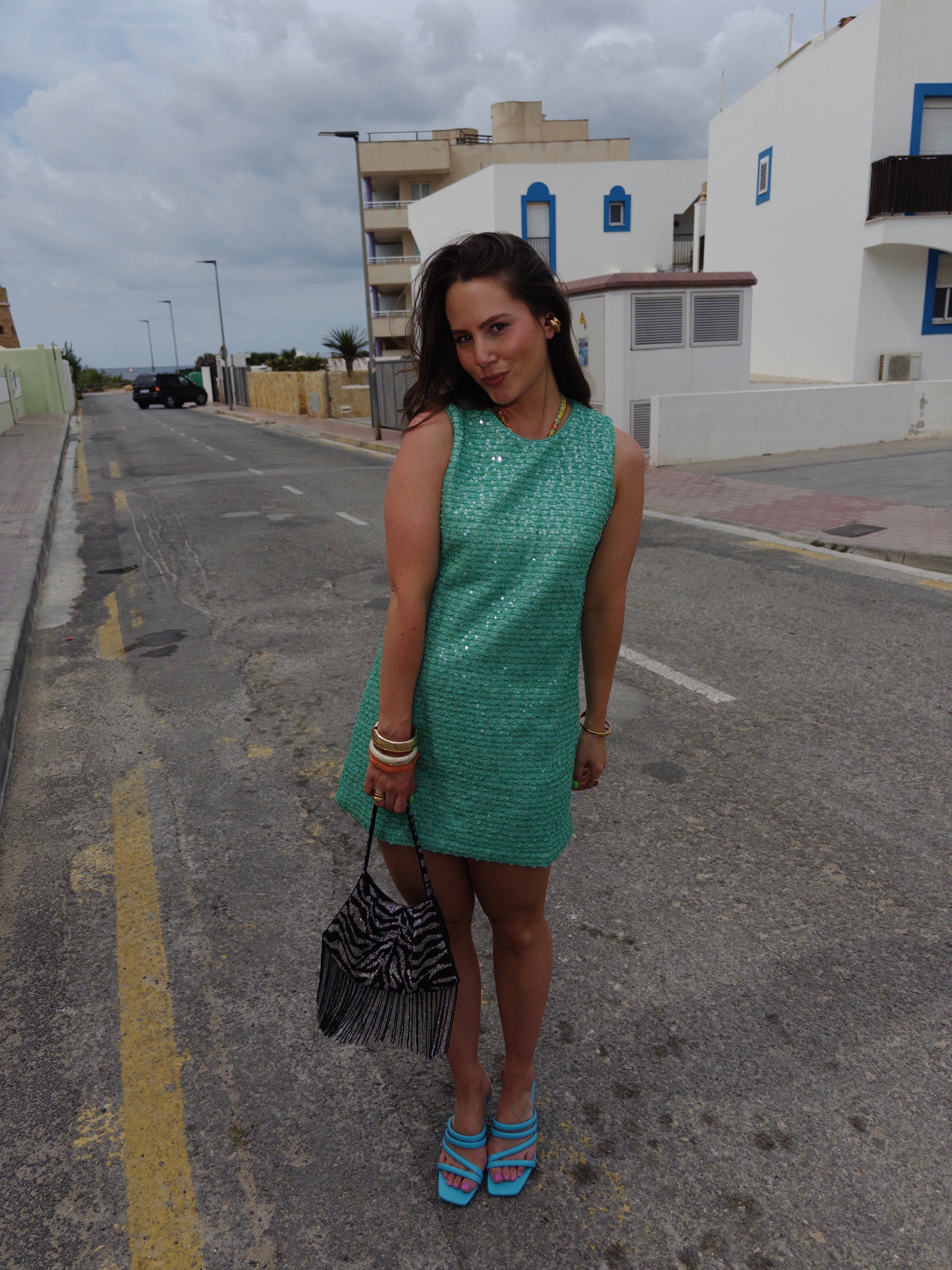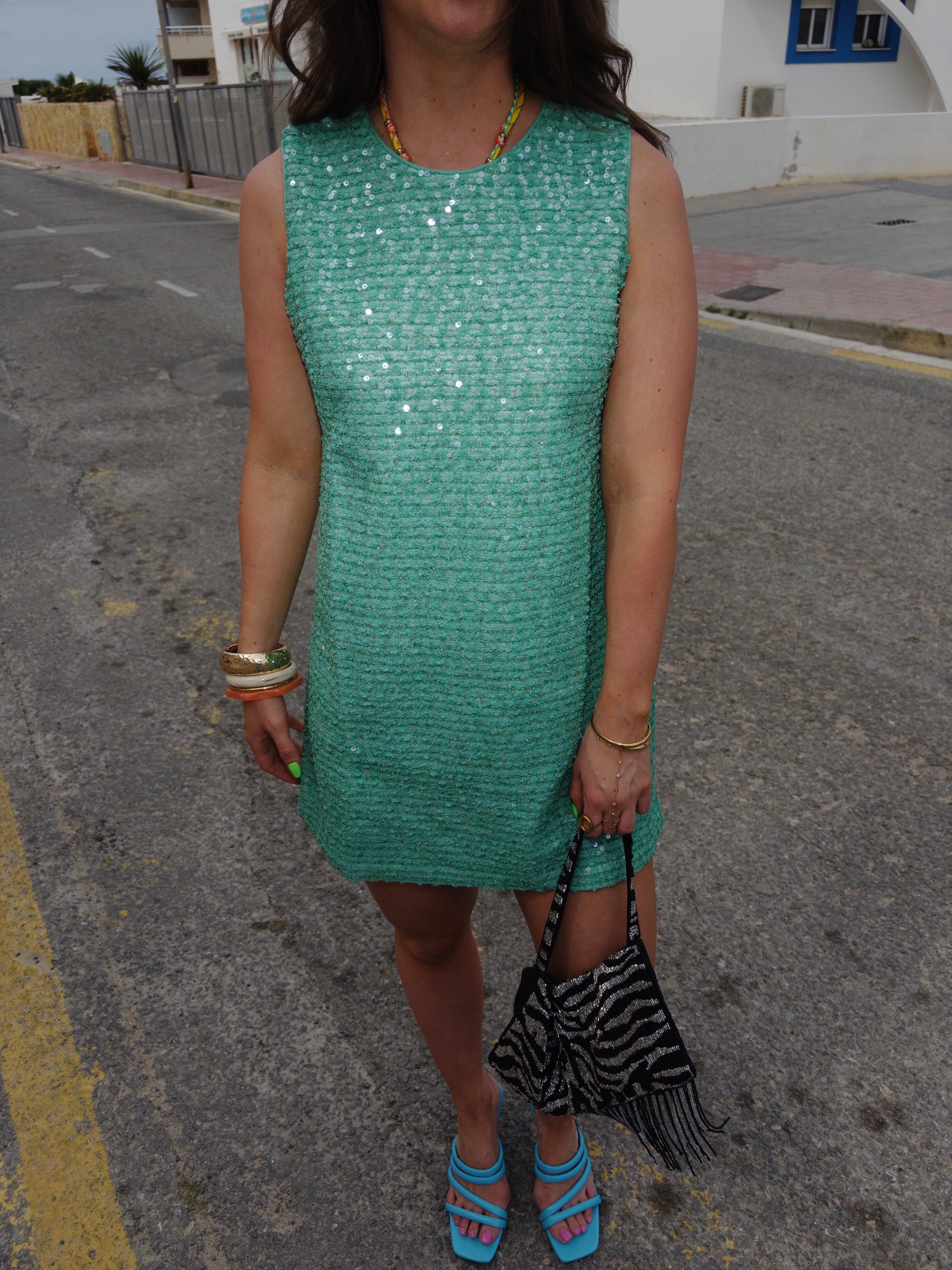 Groene jurk met kleine sequins erop.