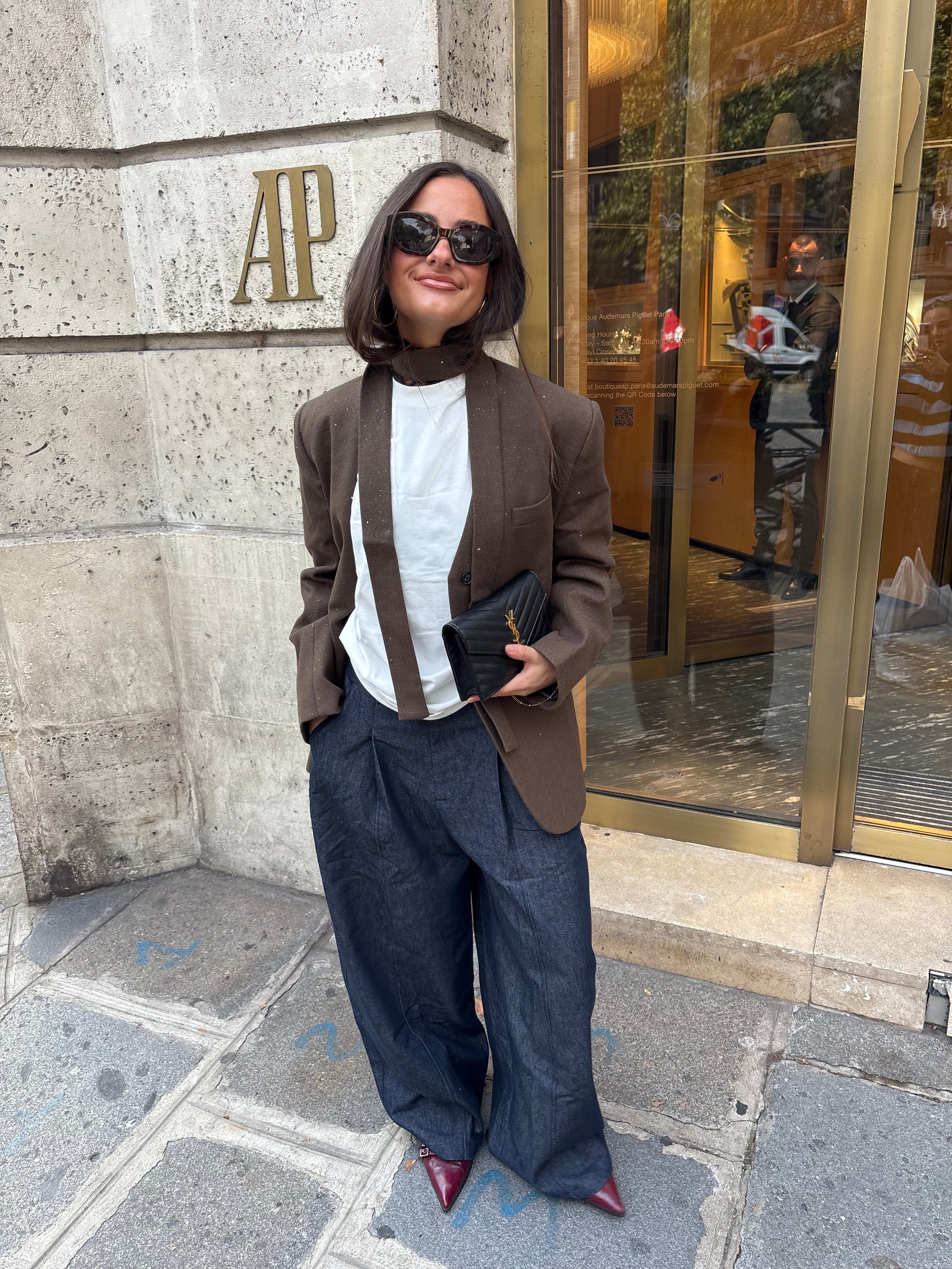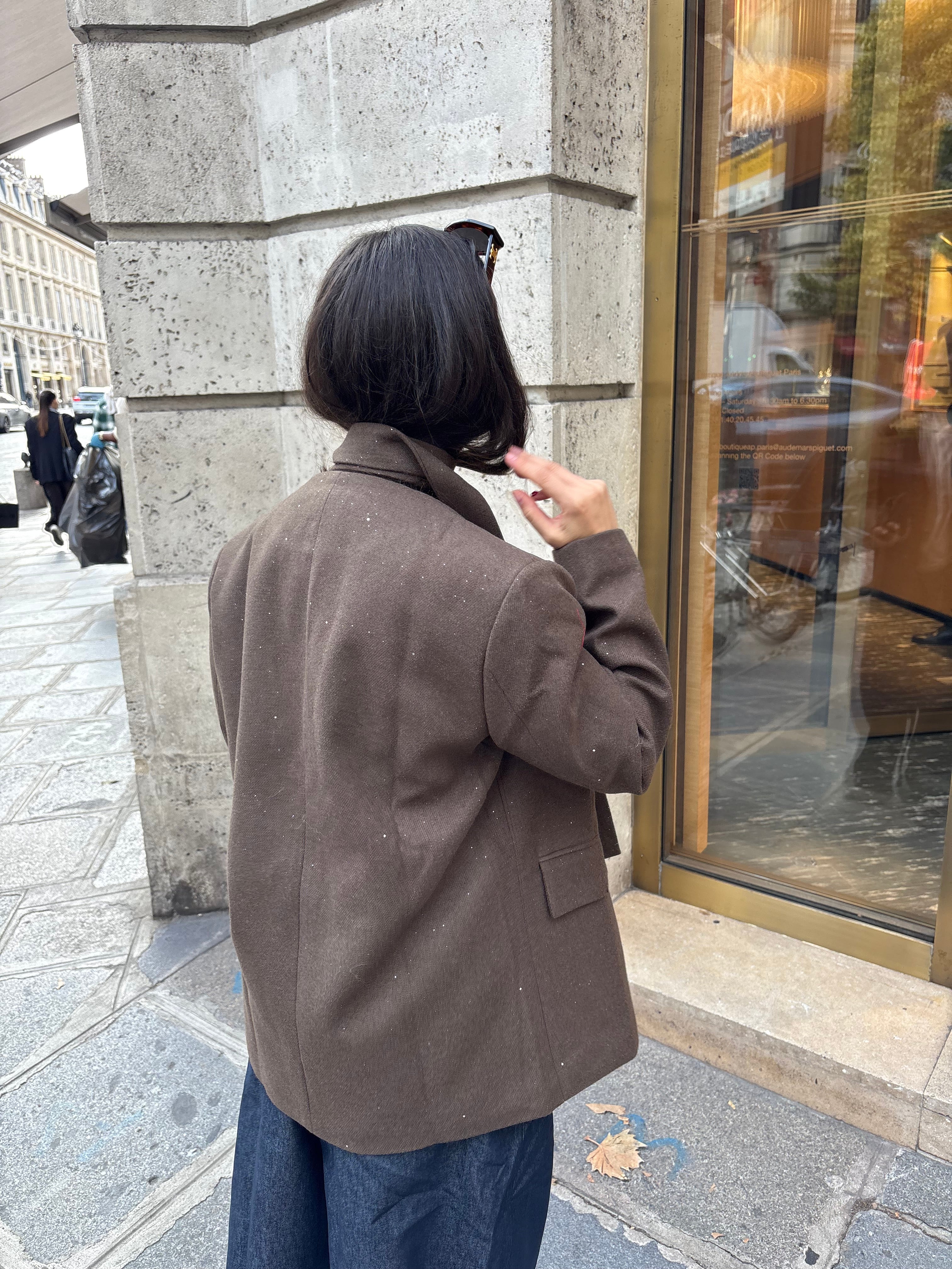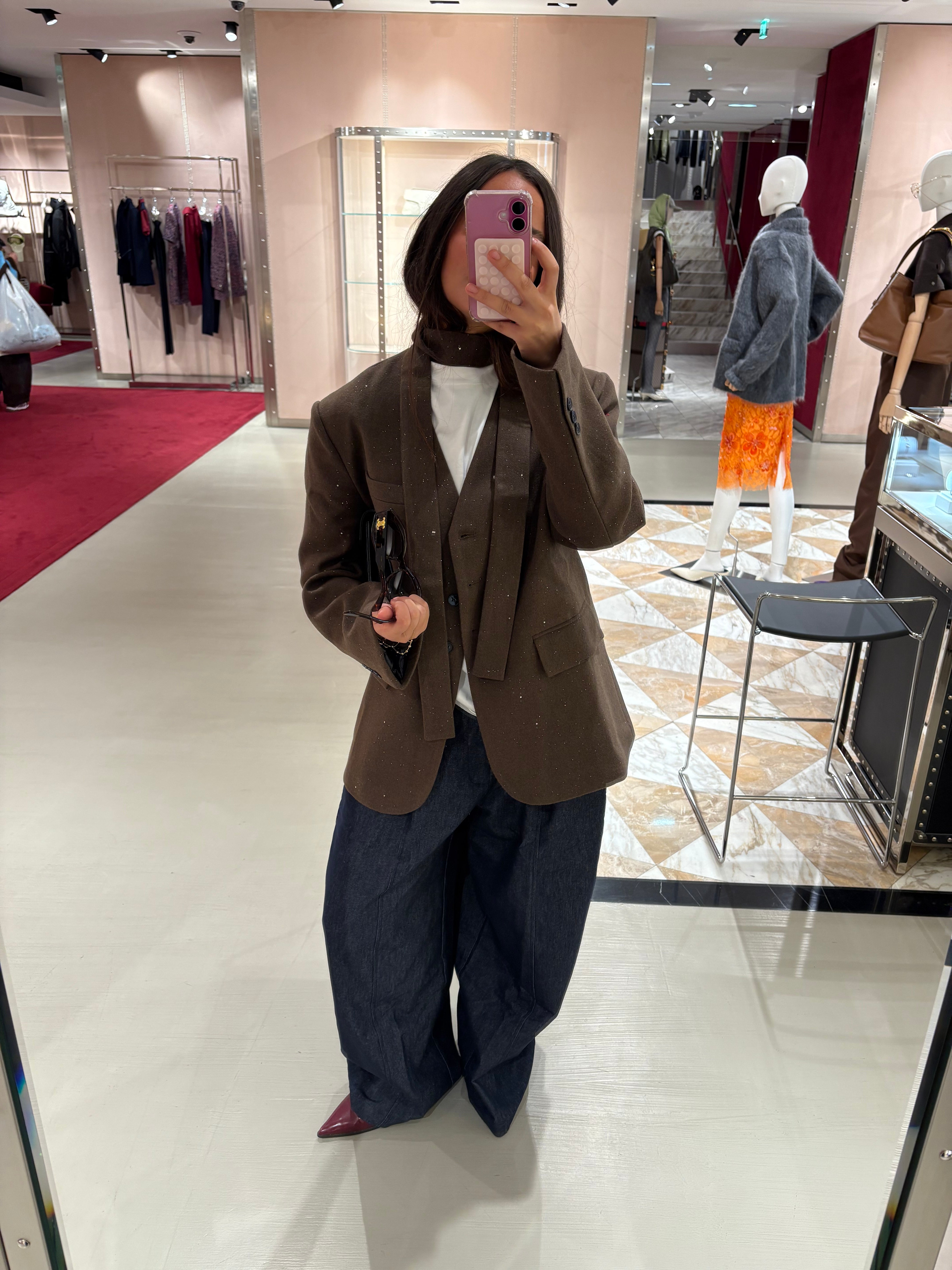 This pre order will be send next week. A green blazer with a subtle sparkle, featuring buttons and a detachable belt that can be worn around the waist or styled as a scarf. The blazer is fully lined on the inside.