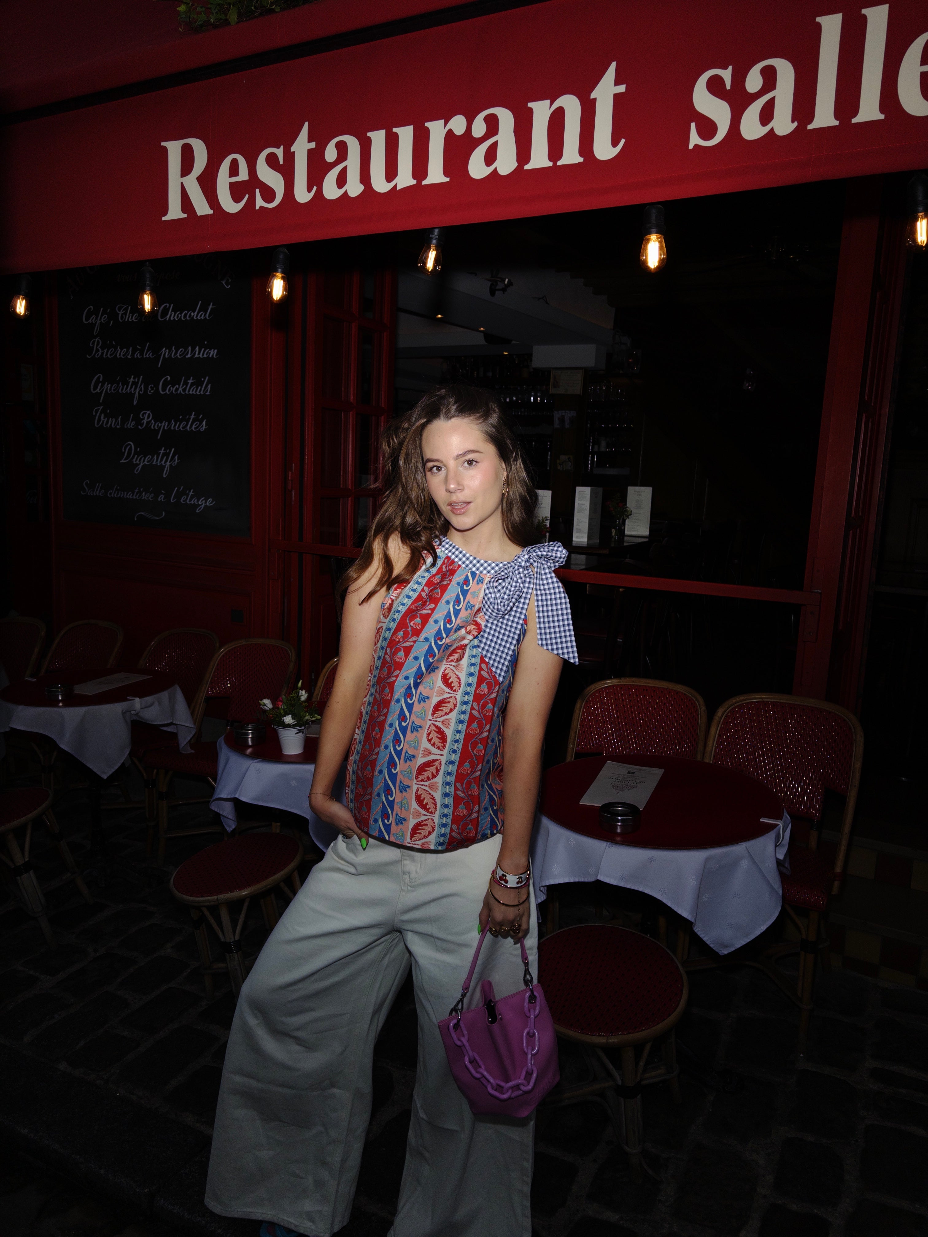 Blauw/wit/rood geprinte top met geblokte strik die je zelf kunt strikken.