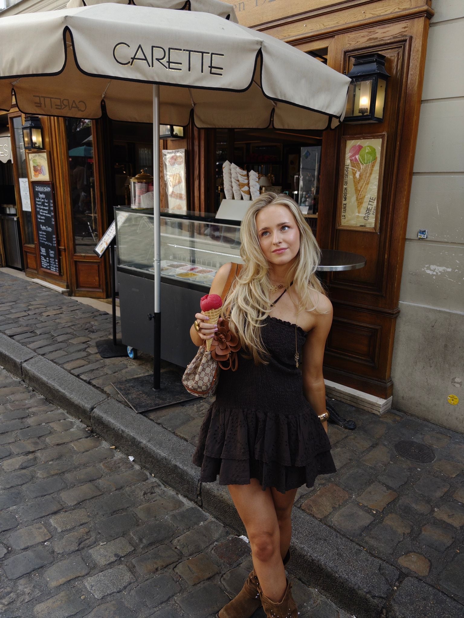 Bruin gesmokte mini dress met laagjes is handpicked by Valerie Brinksma.